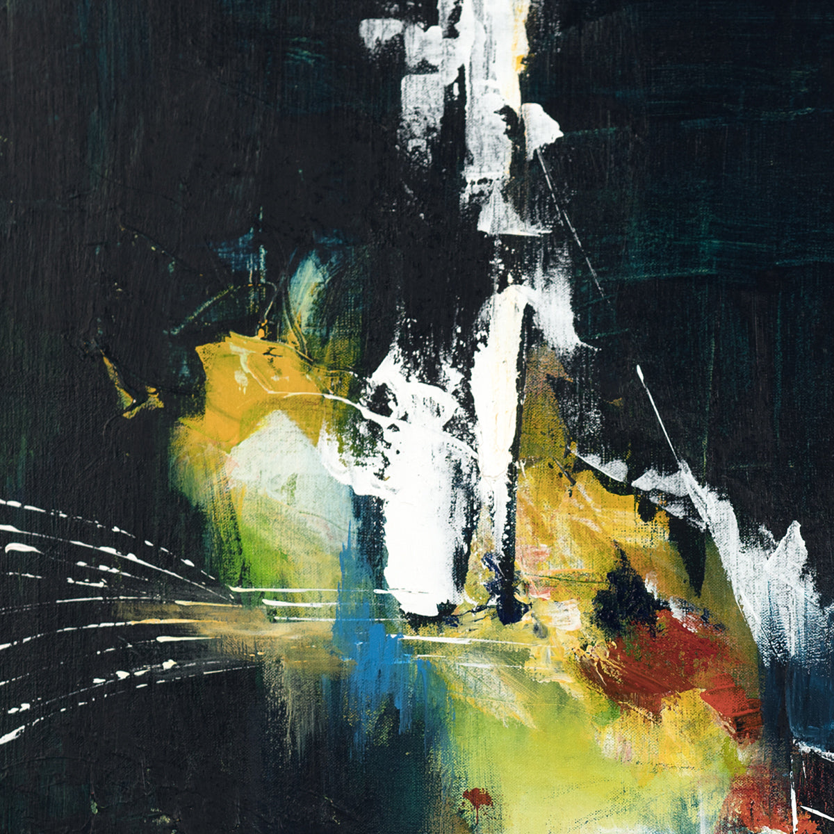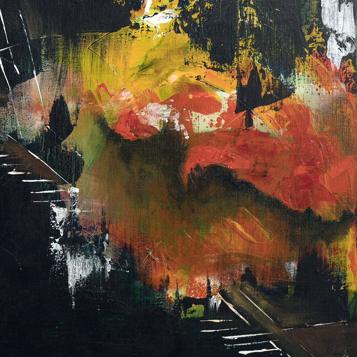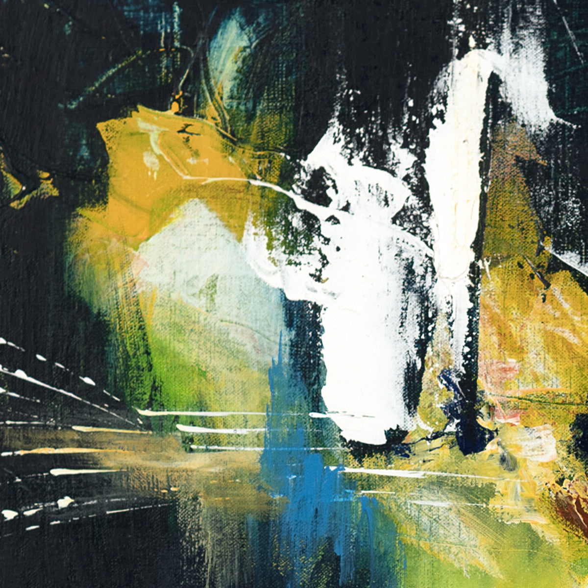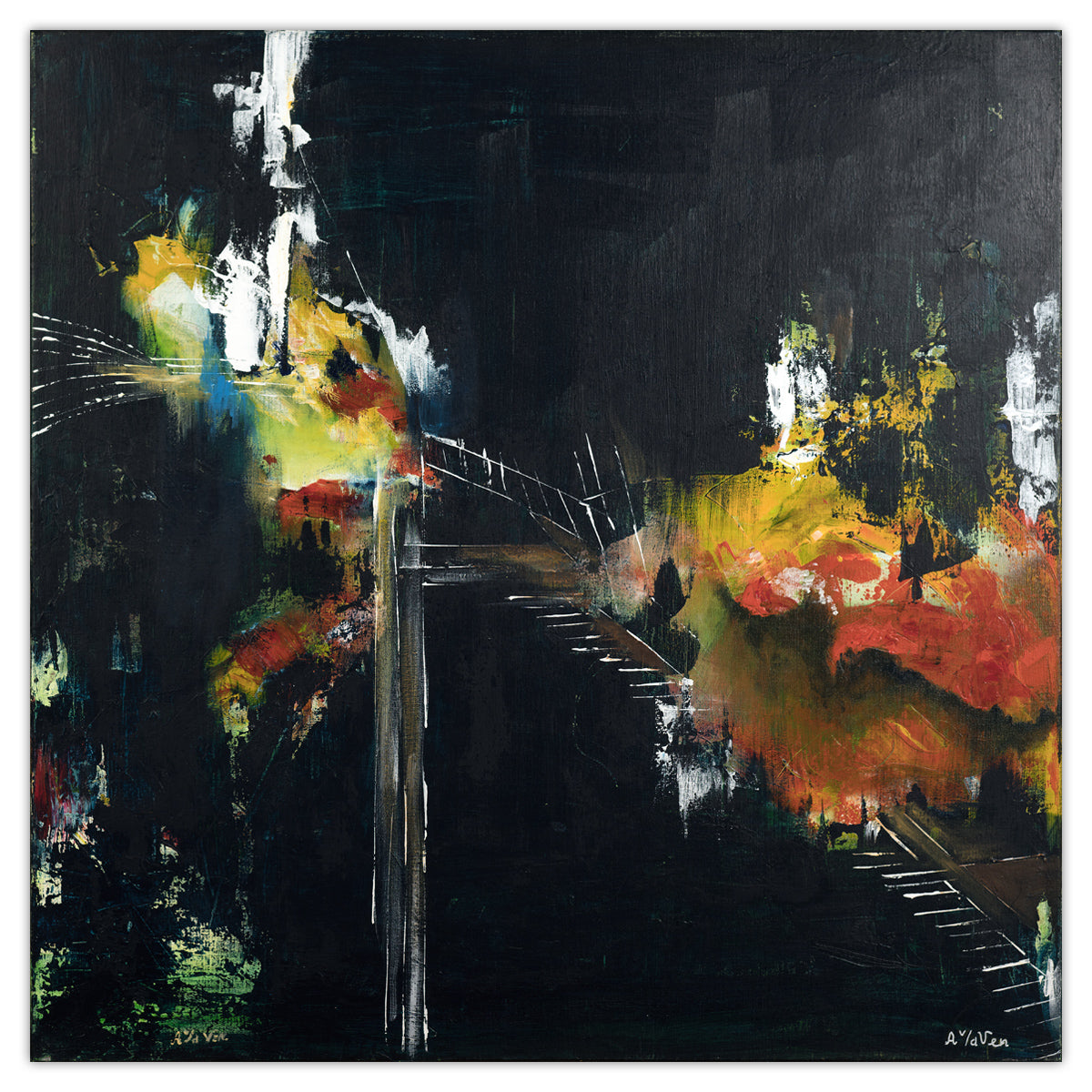 Durch den dunklen Hintergrund heben sich die hellen Farben dieses Gemäldes von der Leinwand ab, sorgen für eine warme Ausstrahlung und erzeugen Tiefe.
