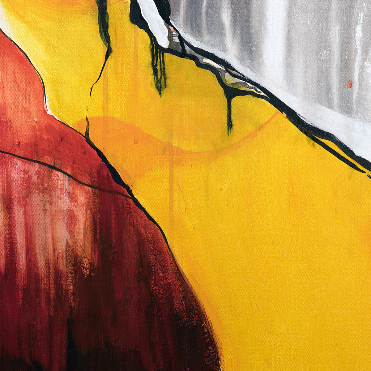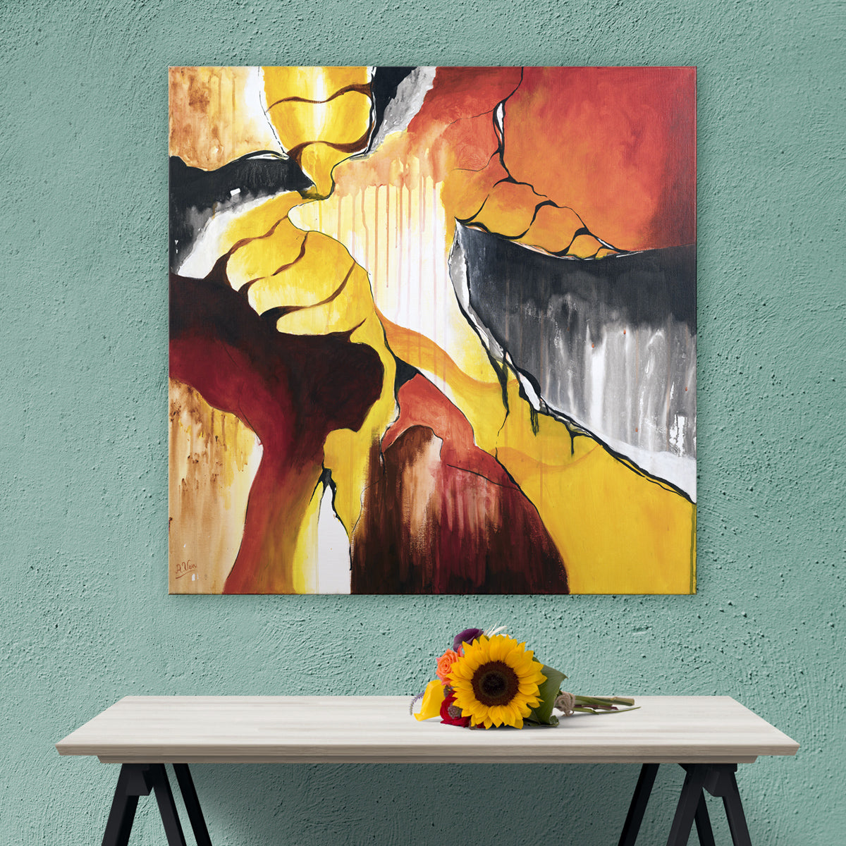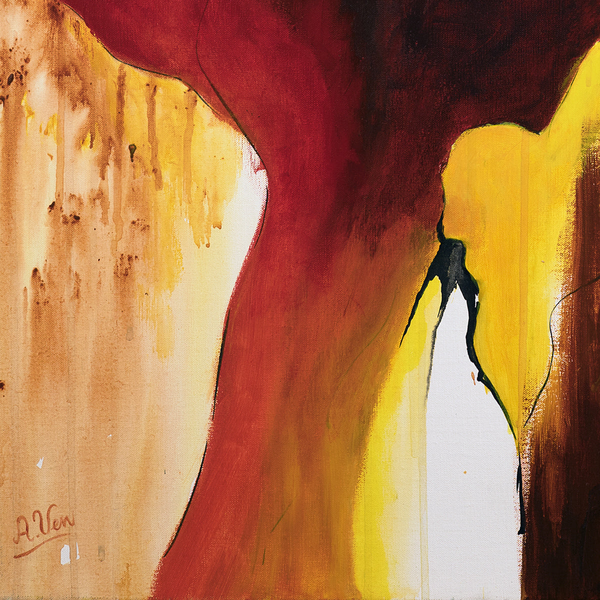 Pintura acrílica y tinta utilizadas sobre lienzo de lino tensado sobre aluminio, 90x90x2,5 cm / 35,43x35,43x0,98 pulgadas.