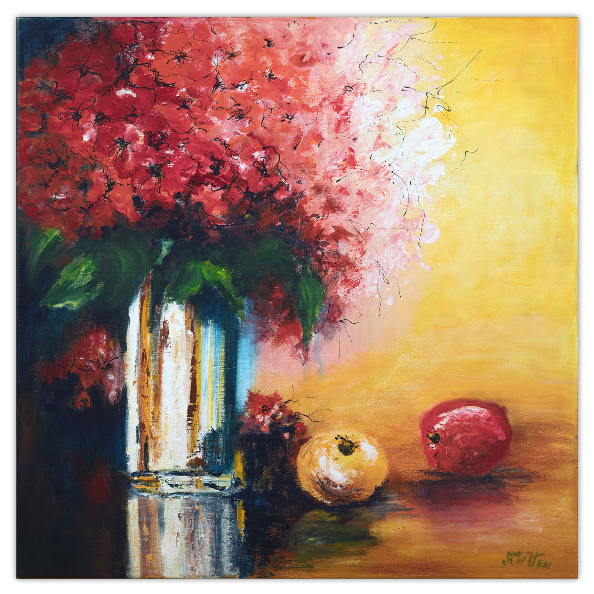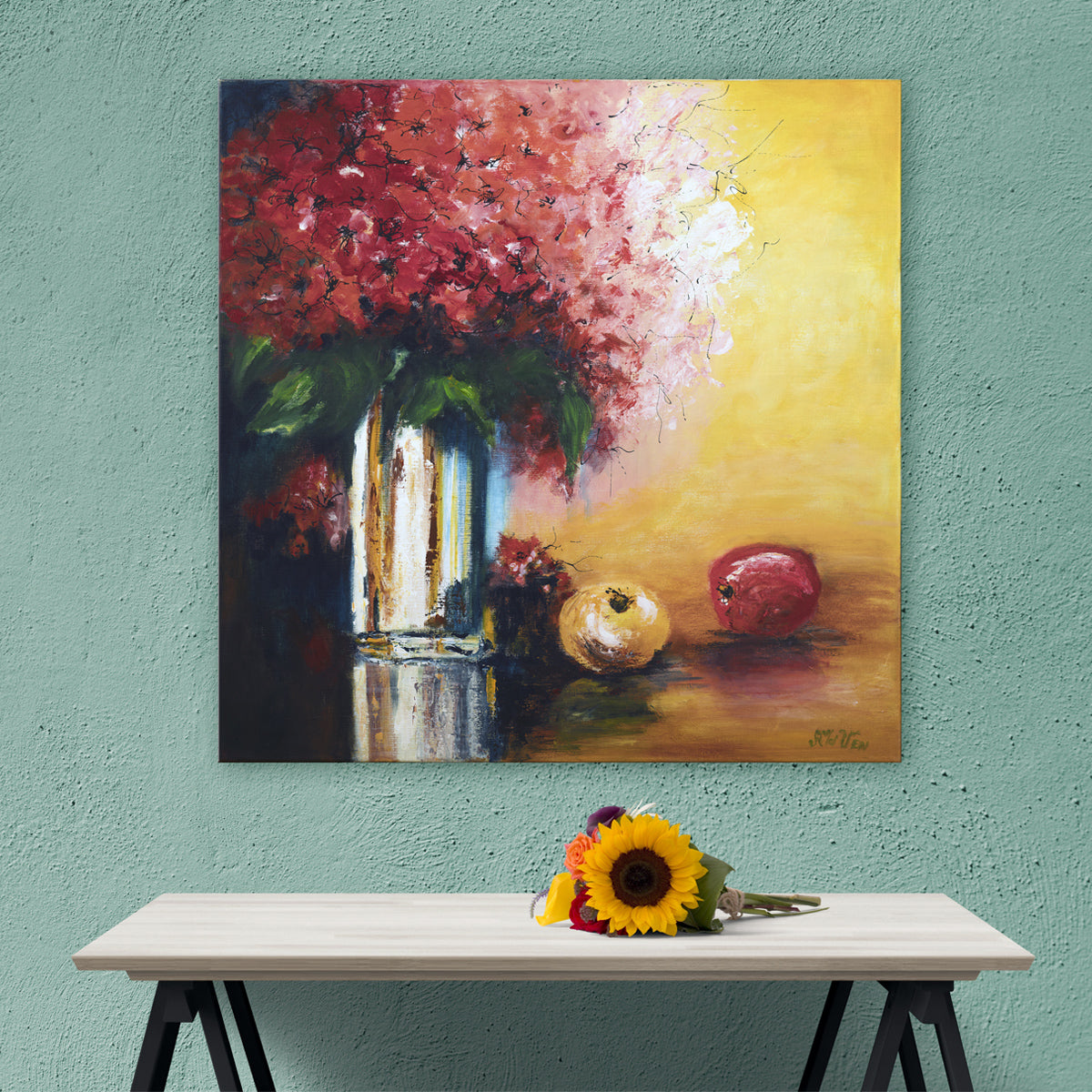 Este cálido y elegante bodegón con flores y frutas crea un llamativo punto focal en cualquier habitación.