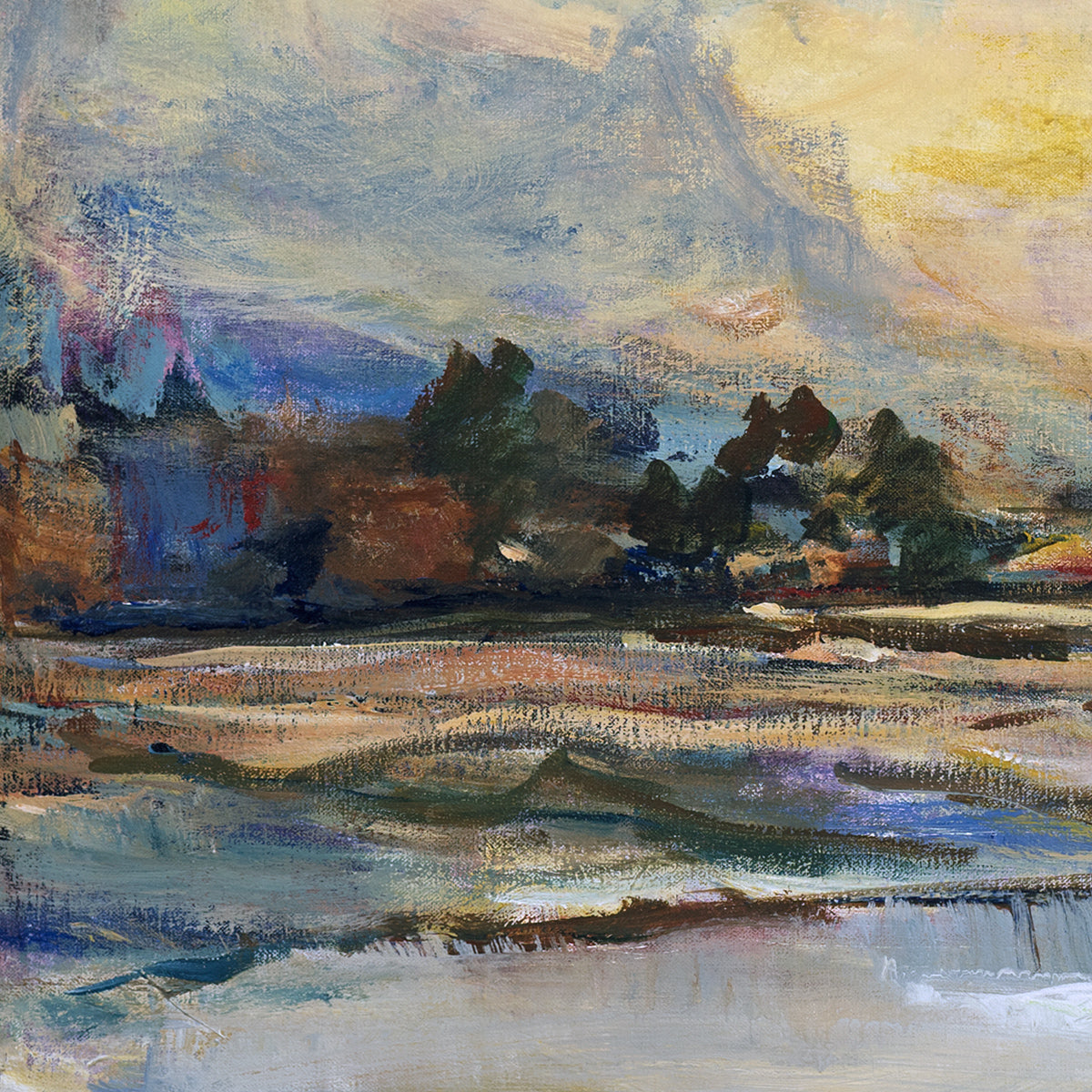 Las pinceladas onduladas en el río y el cielo dan vida y movimiento a la pintura.