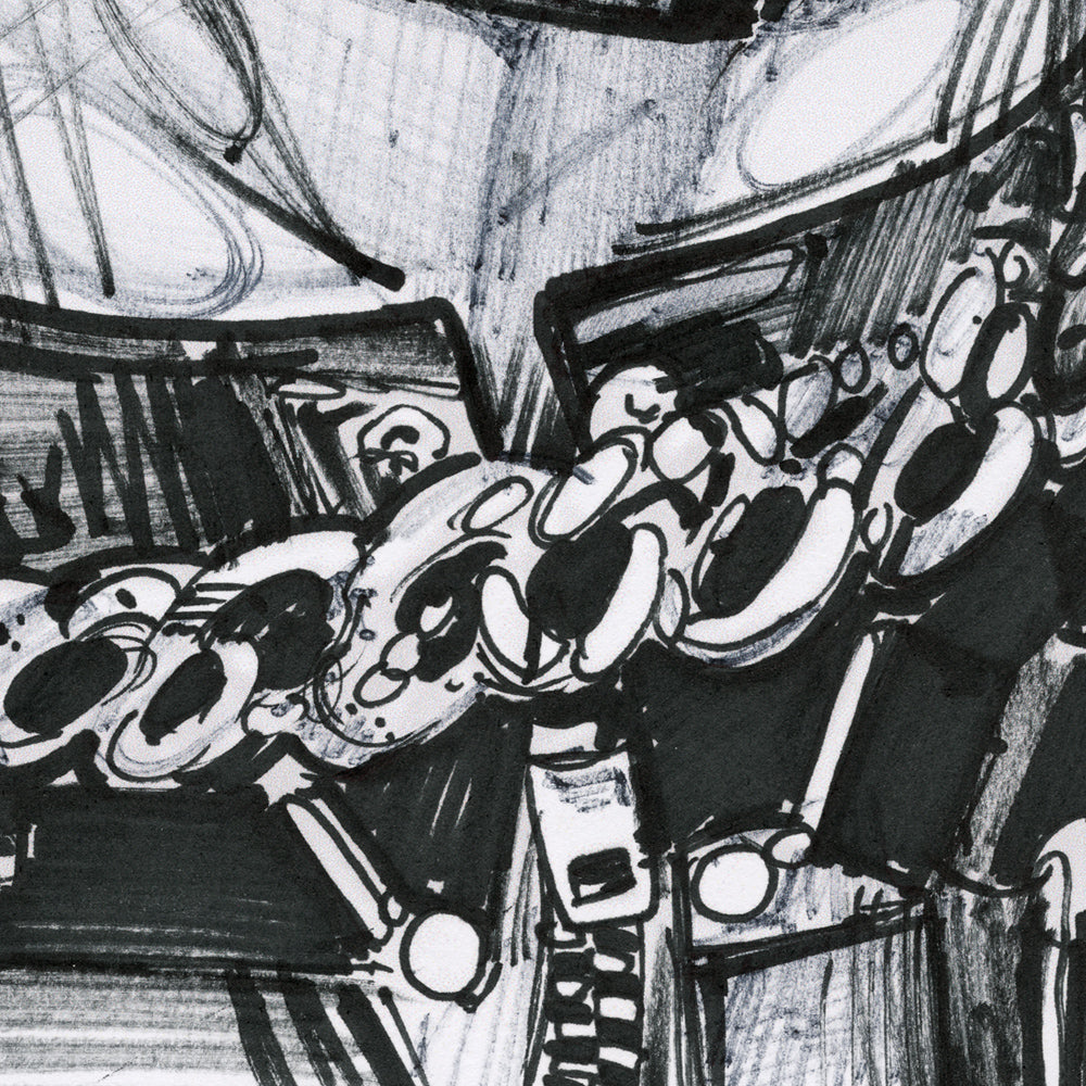 Gemengde technieken (pen, potlood, en Copic markers) op papier 21x29,7 cm / 8.26x11.69 inches.